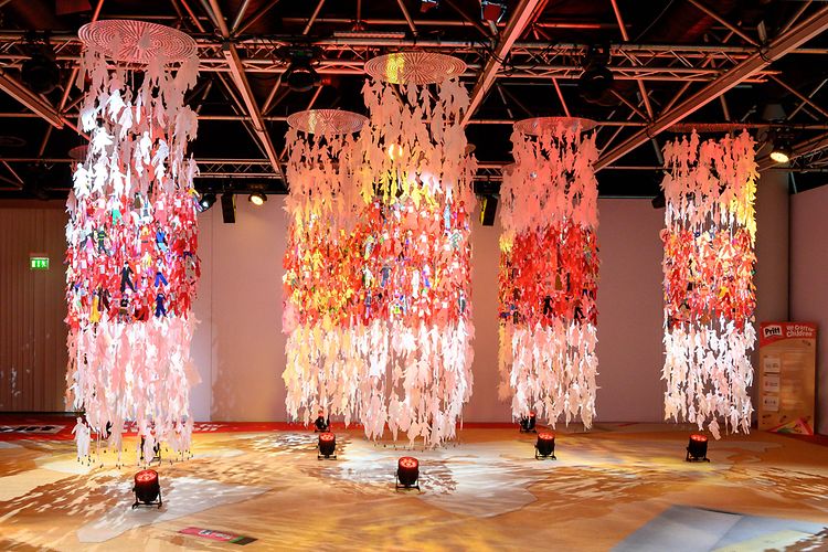 「We craft for children(子どもたちのために工作しよう)」運動は、紙を使ったアートを専門とするドイツ人アーティスト、ヨー・ペレンツ氏のサポートのもと行われました。同氏は今回のために紙人形をデザインし、世界規模の団結した取り組みのシンボルとして、2,300体の紙人形すべてを集めた巨大な夢のペーパーモビールを制作しました。この巨大モビールは、ドイツ、デュッセルドルフのヘンケル本社で行われた授賞式で披露されました。